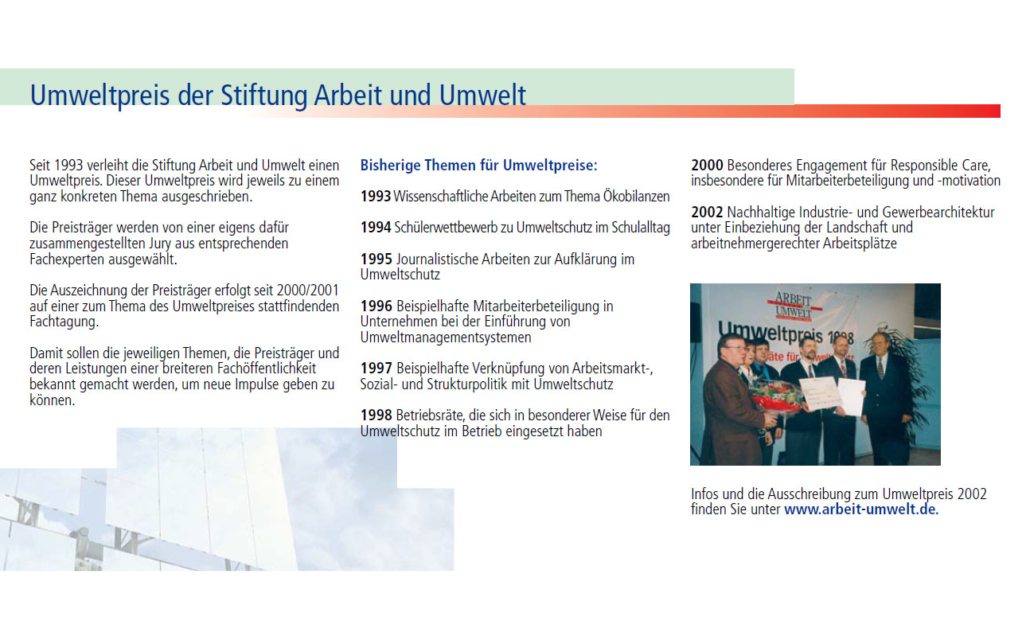 Im Jahr 1993 verleiht die Stiftung erstmals einen Umweltpreis. Die Auszeichnung wird mit einem Preisgeld von 30.000 DM von nun an jährlich an ein oder mehrere Unternehmen und Organisationen für Projekte zum betrieblichen Umweltschutz verliehen. Daneben führt die Stiftung Studien durch, betreut Dutzende betriebliche Bildungs- und Umweltprojekte sowie Maßnahmen, über die Beschäftigte und Mitbestimmungsakteure an betrieblichen Nachhaltigkeitsprojekten beteiligt werden.