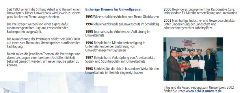 Am 5. und 6. Oktober 2000 feiert die Stiftung in Halle ihr zehnjähriges Bestehen unter dem Motto „10 Jahre Stiftung Arbeit und Umwelt – Chemie und Nachhaltigkeit“.
