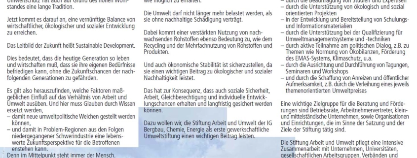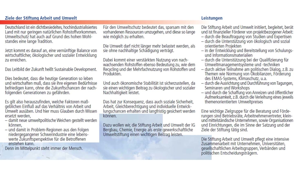 Gegründet, um die nachhaltige Entwicklung und den betrieblichen Umweltschutz in den neuen Bundesländern zu fördern, war die Stiftung Arbeit und Umwelt der IGBCE einer der ersten gewerkschaftlichen Akteure, der sich mit den Fragen der Transformation, Nachhaltigkeit und Guter Arbeit in den energieintensiven Industrien auseinandersetzte.