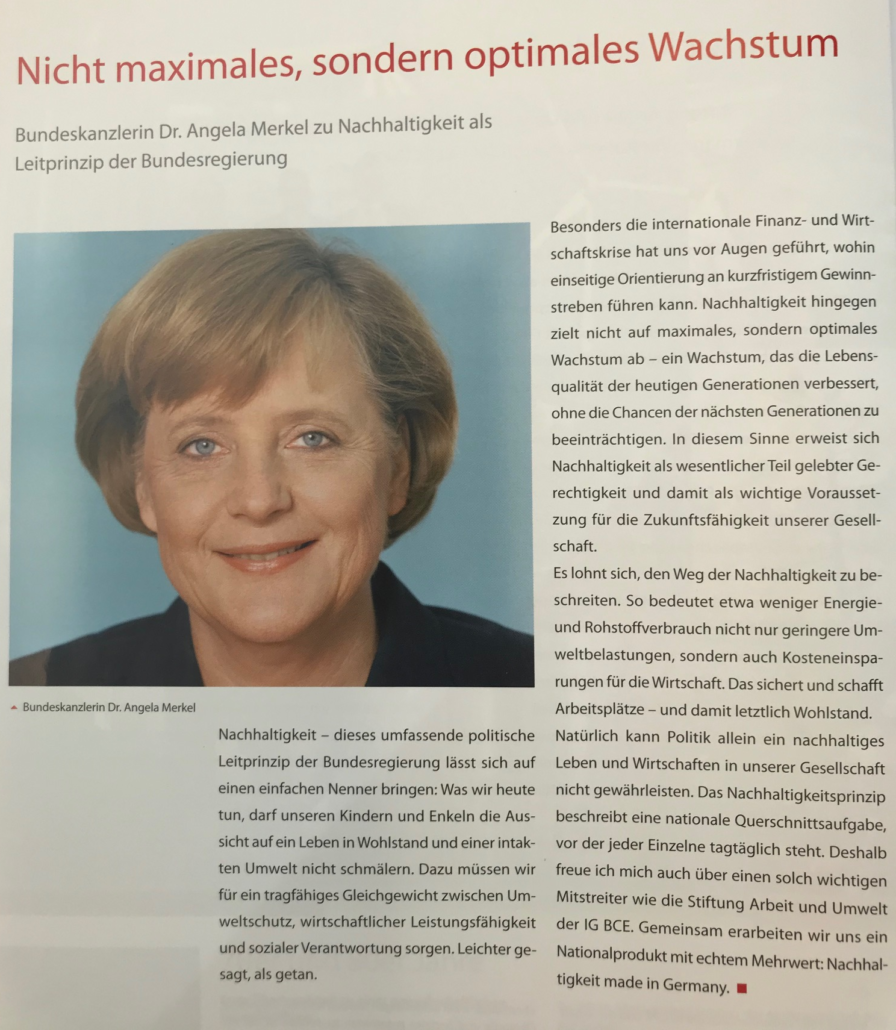 Bundeskanzlerin Dr. Angela Merkel, die von 1994 bis 1998 stellvertretende Vorsitzende der Stiftung Arbeit und Umwelt war, schreibt in ihrem Grußwort zum 30-jährigen Jubiläum der Stiftung:
